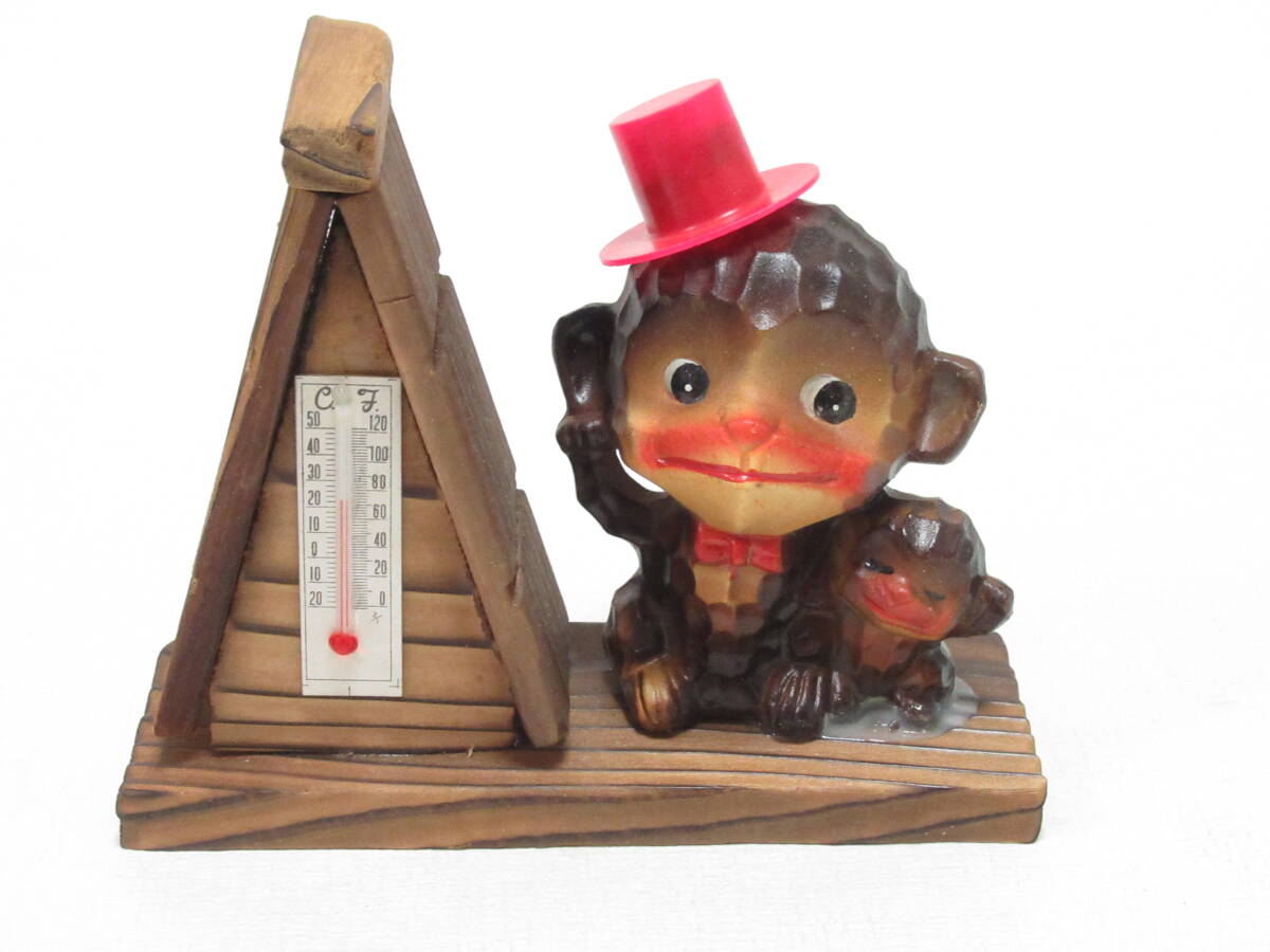 - 昭和レトロ おみやげ 温度計付き 置物 帽子が可愛い 木彫風の陶器のお猿さん /観光/Vintage KOKESHI DOLL Japanese Souvenir