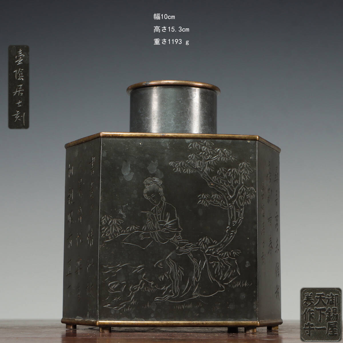 - 古錫 茶葉罐 御錫屋天下一美作守 「錫刻人物詩文包銅辺大茶心壺」 茶筒 茶入 茶壷 茶道具 錫肌 金工 茶器 時代物 重さ1193g LT-251009