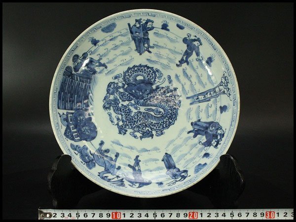 > 【銀閣】中国美術 青花 龍人物紋 φ27cm 盤 旧家蔵出 送料無料(HA315)