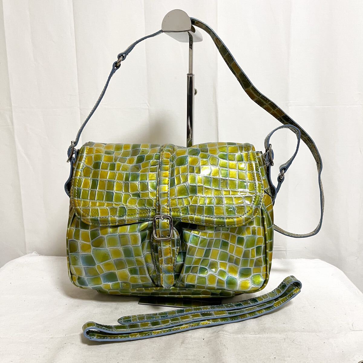 - 和859★ COCCO FIORE コッコフィオーレ ショルダーバッグ 斜め掛け エナメル クロコ型押し グリーン イエロー レディース