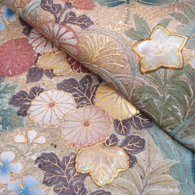 - ★きもの北條★ 螺鈿 引箔 金彩 花の図 秋草 紫陽花 お太鼓柄 仕立て上がり 中古 正絹 袋帯 T804-18