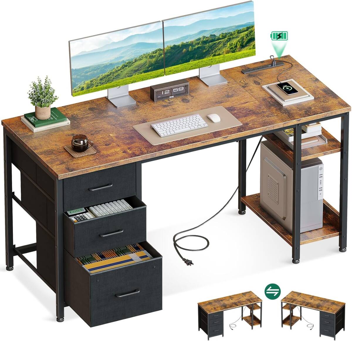 > ビンテージ色 AODK ゲーミングデスク パソコンデスク 引き出し&コンセント付き 机 pcデスク 幅130cm ラック付き 勉強机 ゲーム