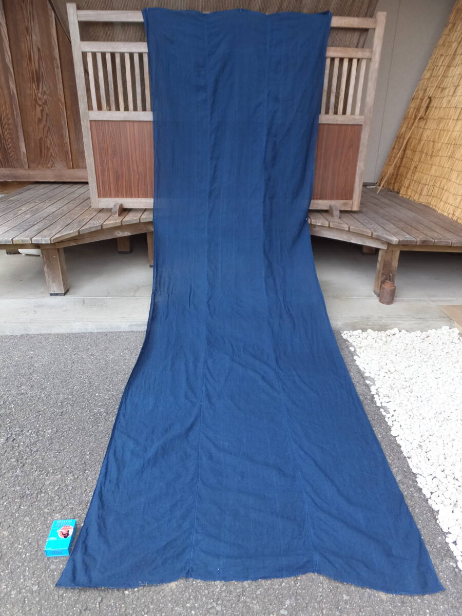- 昔の蚊帳に使われていた目の詰まった薄手の手織り藍木綿古布・長い3幅繋ぎ(5幅分)・長324×幅101㌢・総重350g・リメイク素材