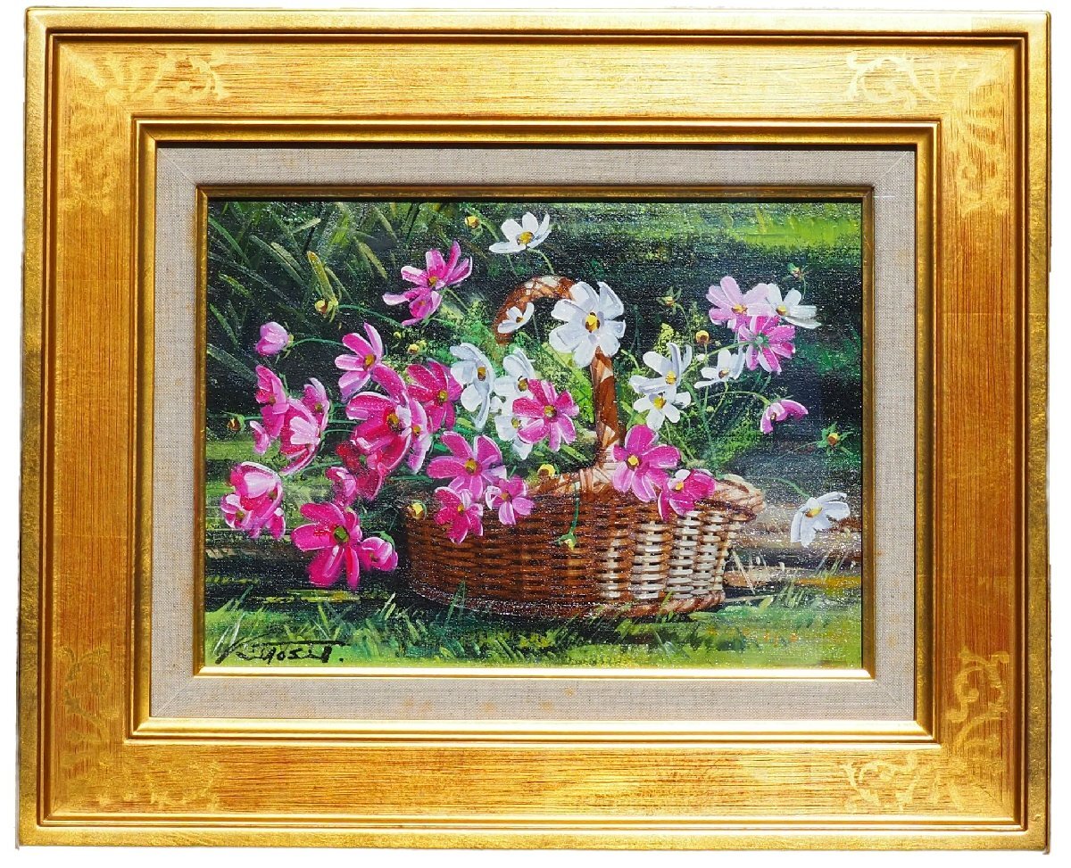 > 【真作】 田中清 絵画 ●リアリズム ≪ コスモス ≫ ◆松坂屋本店購入品 写実 静物画 人気作家 油彩画 花 秋桜