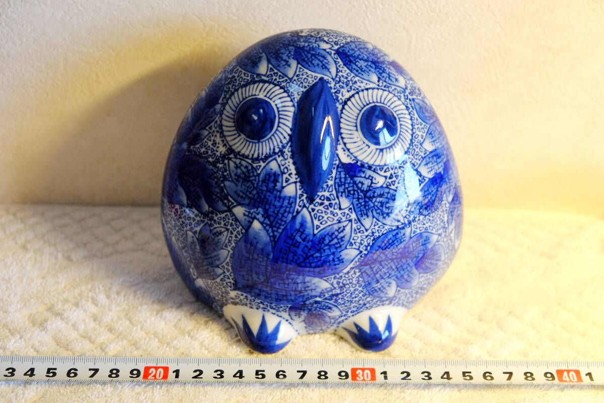 - フクロウ 陶器 置物 青白 ふくろう 梟 オブジェ 縁起物 飾り物 藍色 ☆1012~出778