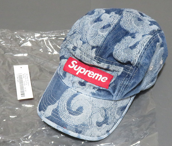 - 23ss Supreme Washed Indigo Flames Jacquard Denim Camp Cap