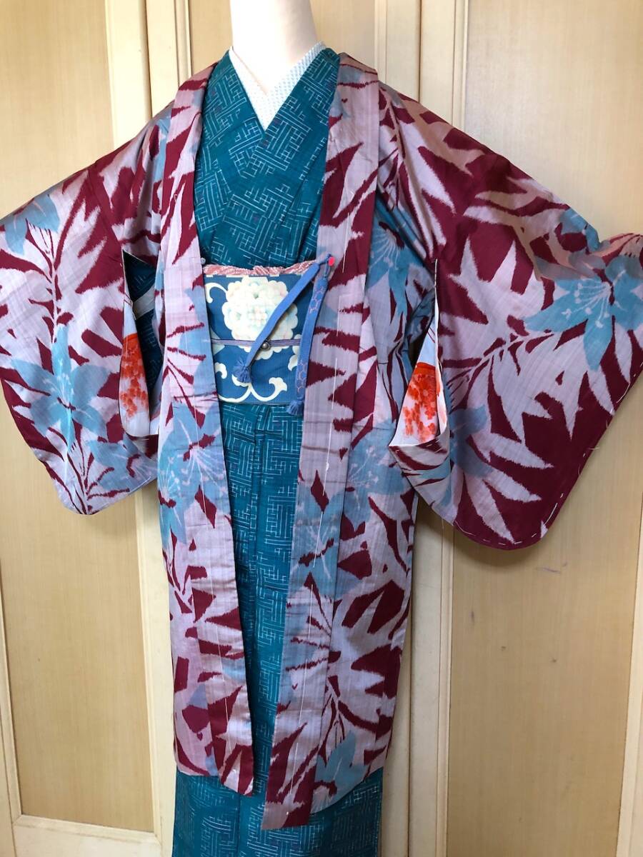 > あこ也*正絹銘仙長羽織紐付き未使用丈100.5裄64.6cm水色の花アンティーク大正ロマン