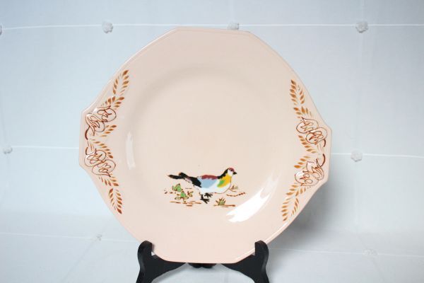 - フランス アンティーク LONGWY 古い陶器のGIBIERのプレート オクトゴナル ベビーピンク ゴシキヒワの絵 美品