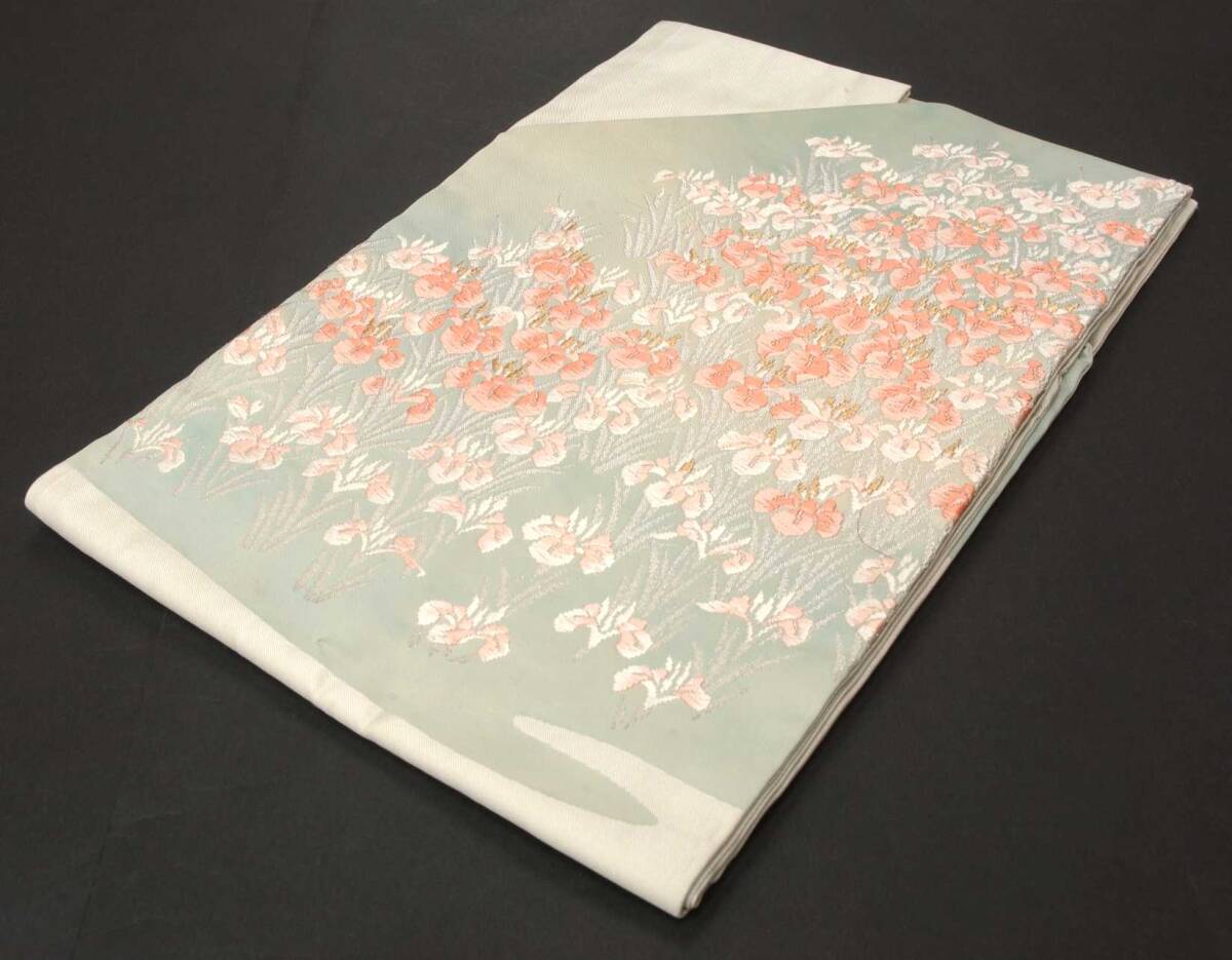 > ☆名古屋帯☆唐織 白~薄い緑 菖蒲 正絹☆しつけ付未使用