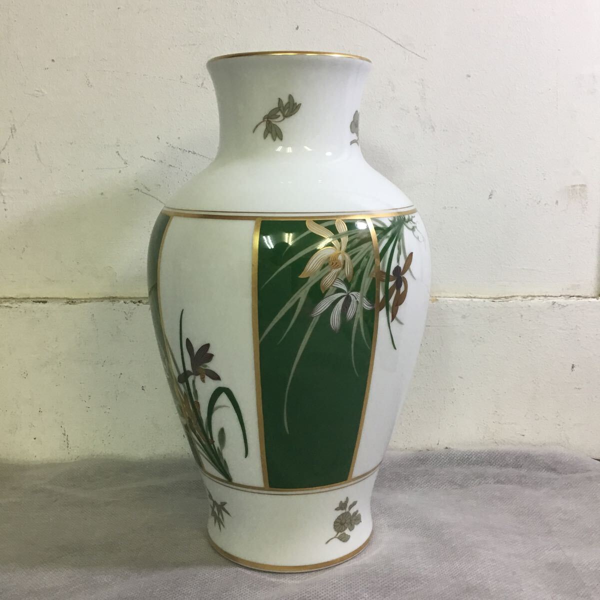 - 大倉陶園 1978年 フランクリン・ポーセリン Franklin Porcelain 四君子之内 蘭 竹 梅 菊 花瓶 陶磁器 グリーン 金彩 置物インテリア JAPAN