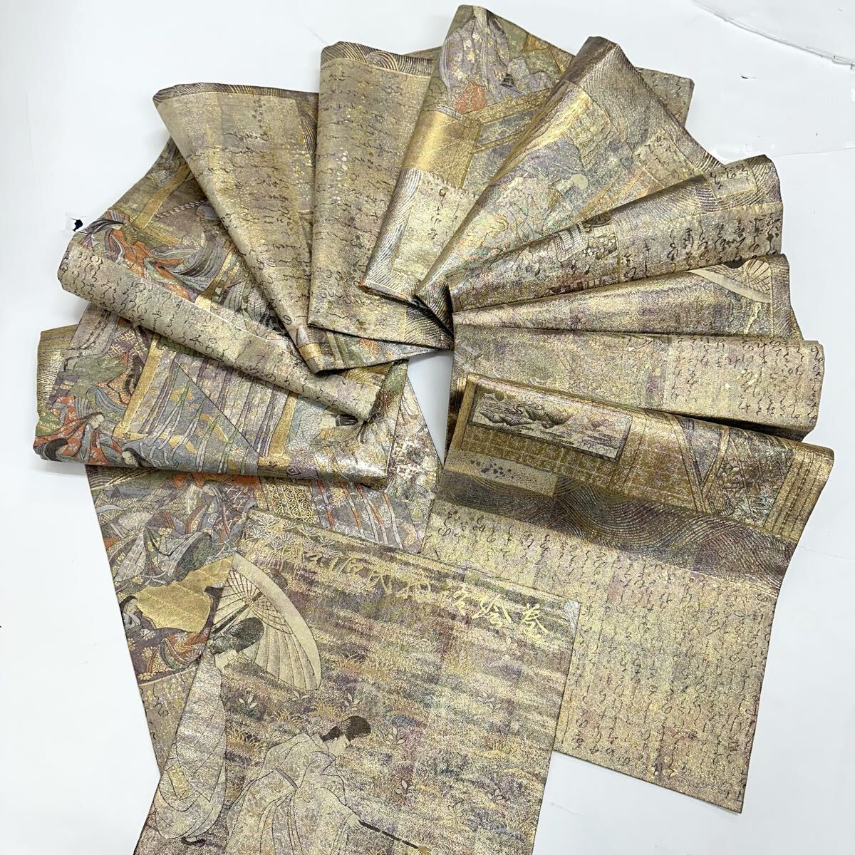 - 【七福】c919 逸品 高級品 正絹 丸帯 全通 西陣あさぎ 国宝源氏物語絵巻 金糸 金色 箔 豪華