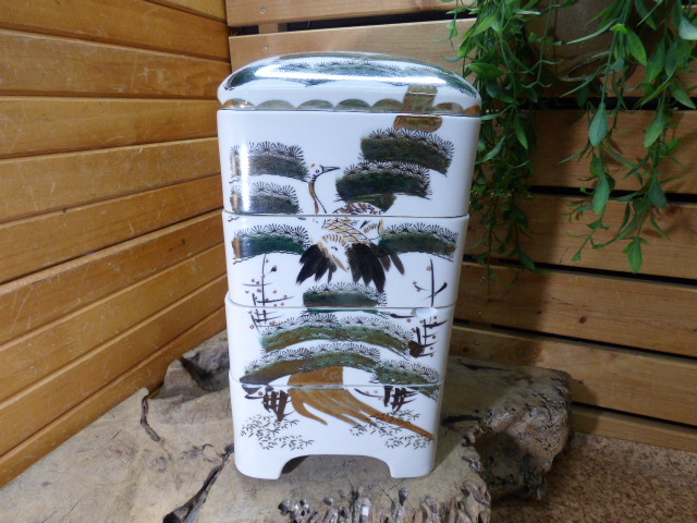 - む692.陶磁器製 重箱 4段 鶴 松 金彩 赤峰謹製 コレクション