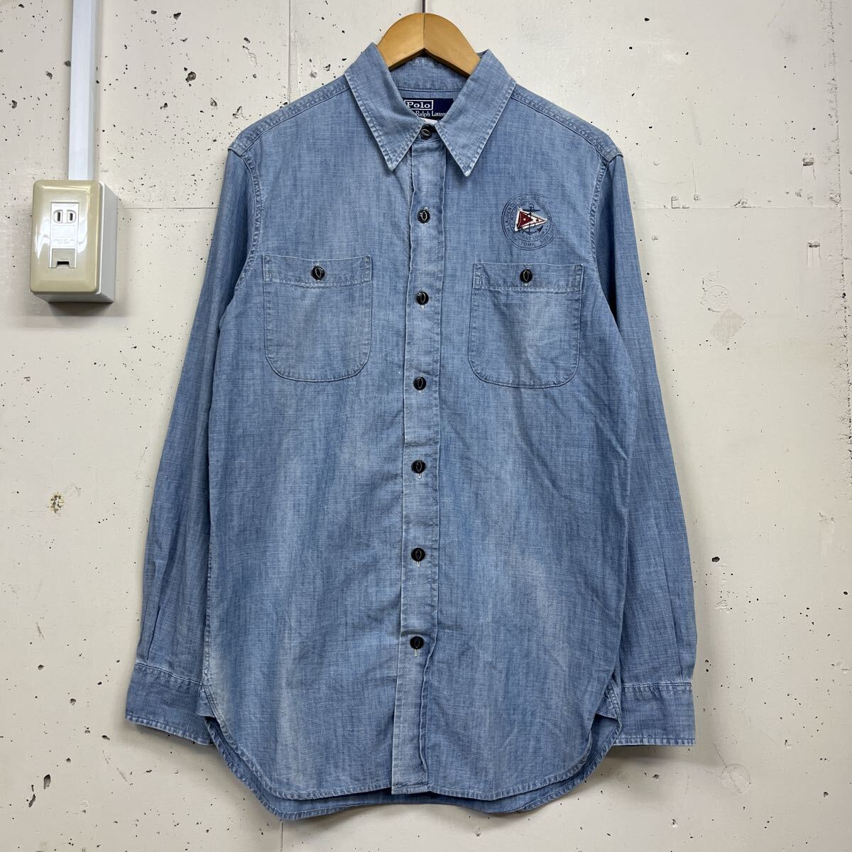 > Polo Ralph Lauren ポロラルフローレン シャンブレーシャツ 長袖 フラッグ メンズ M マチ付 チンスト メタルボタン ブルー
