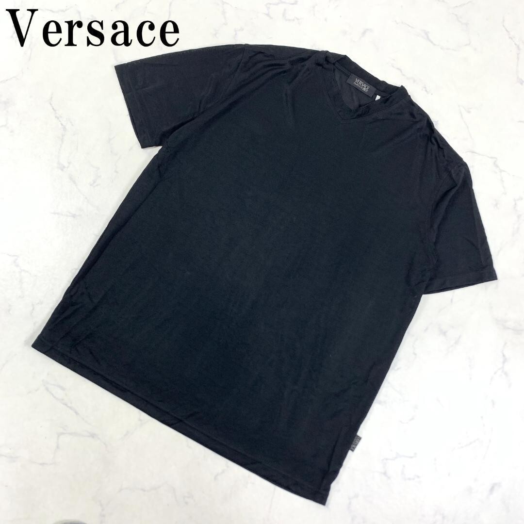 - LA7623 ヴェルサーチ Versace Vネック カジュアル 透け感有 ナイロン 半袖カットソー ブラック XL