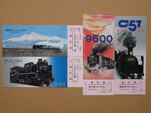 - 昭和49~51年 国鉄 北海道 さよなら SL 記念切符 計4点 釧網本線 蒸気機関車 C57 D51 9600 北海道総局 釧路鉄道管理局
