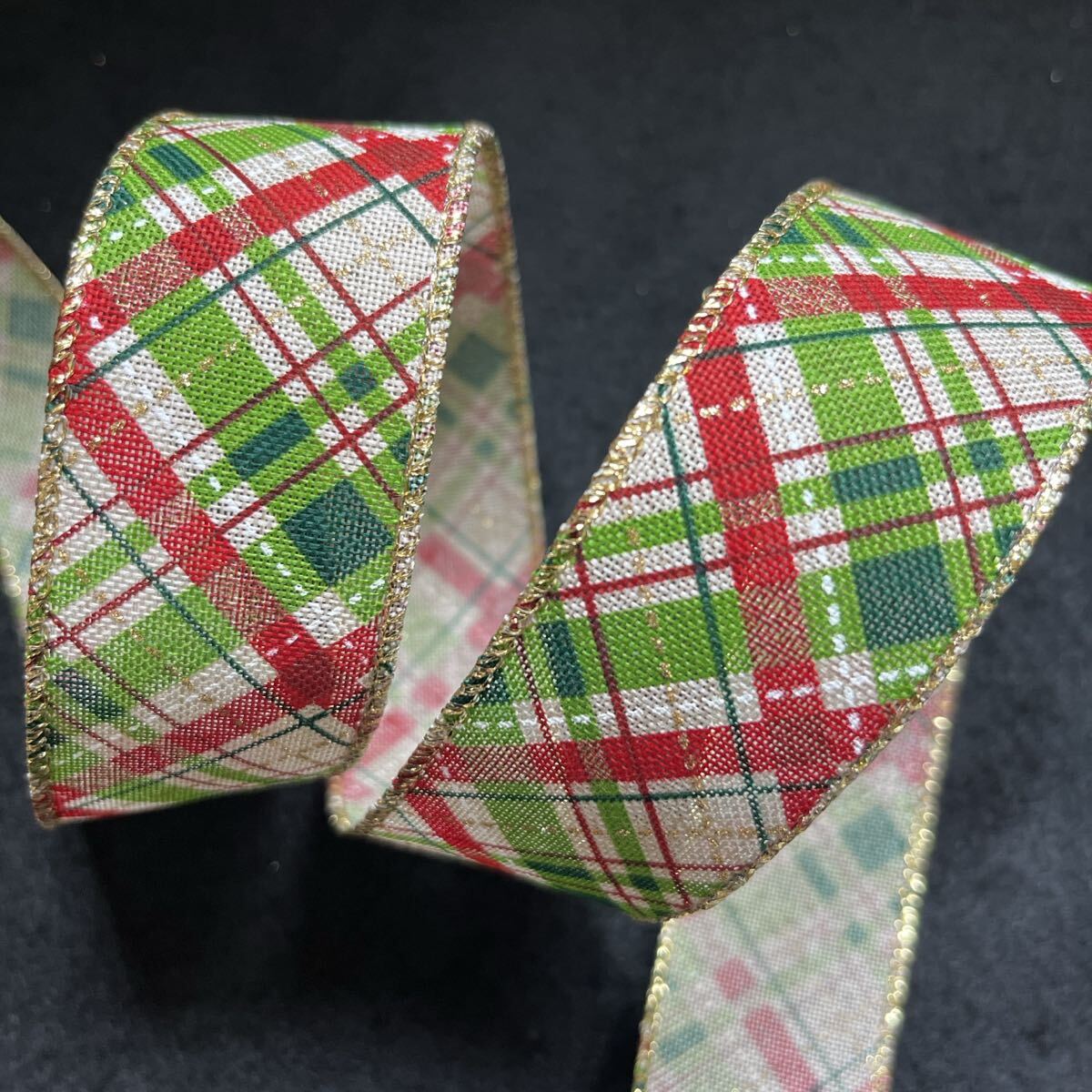 - リボン切り売 1.5m 約3.8cm幅 クリスマスリボン ベージュ チェック柄 クリスマスチェック