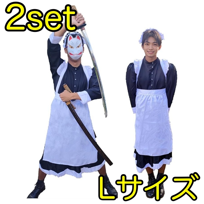 > (2セット)[COCCIA] 2WAY変身メイド鬼滅風 (Lサイズ)6点セット 男性用メイド服 ビッグサイズ 狐面 網タイツ ワンピース ドレス エプロン