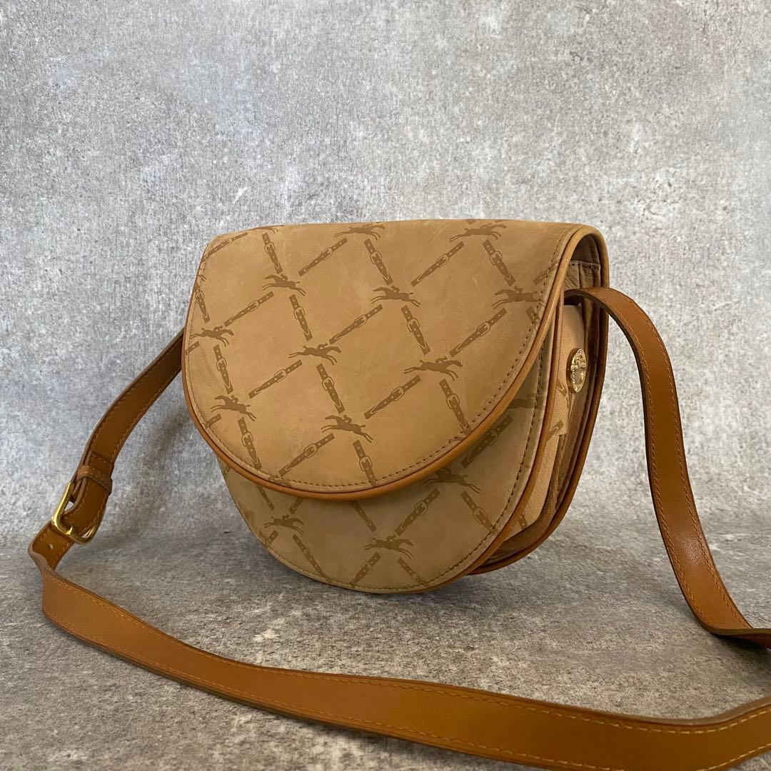 - ロンシャン ショルダーバッグ ポシェット スエード レザー 千鳥柄 ベージュ