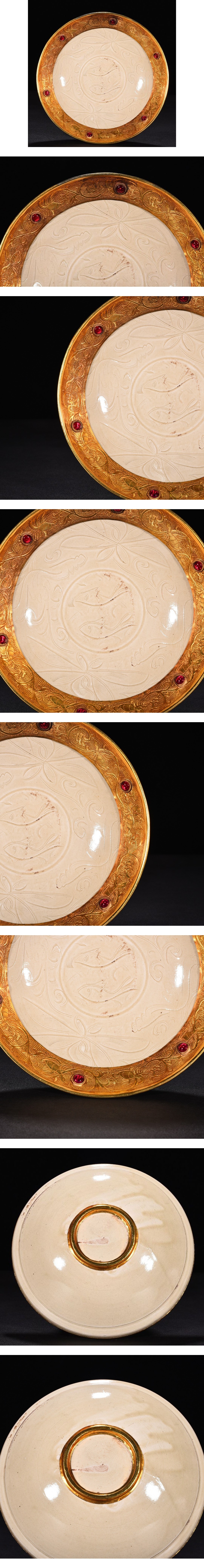 - TA382■宋朝時代 定窯包金 嵌寶石 刻魚藻紋盤 時代物 古玩 唐物 古陶磁器■