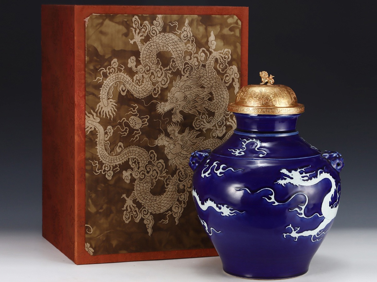 - ▽鴻▽元時代 陶磁器 祭藍釉白龍紋獣耳罐 銅金蓋 箱付 時代物 中国古美術 骨董品
