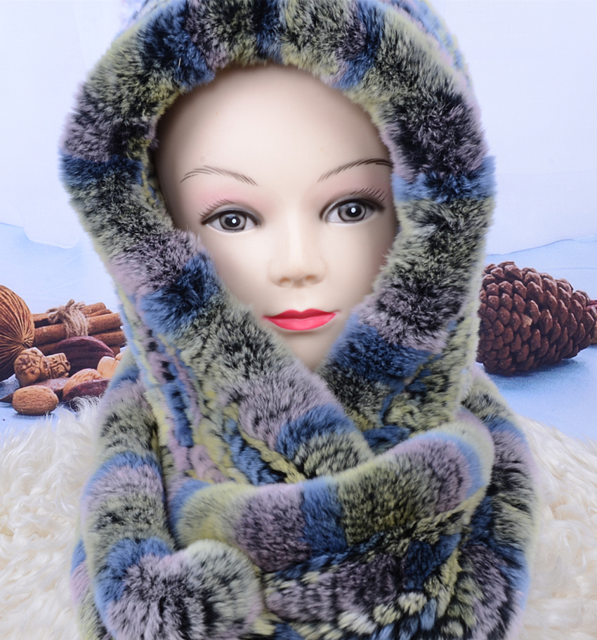 - 柔らかな毛皮の レッキス編み込み二重巻フード付スヌード 毛皮ファー