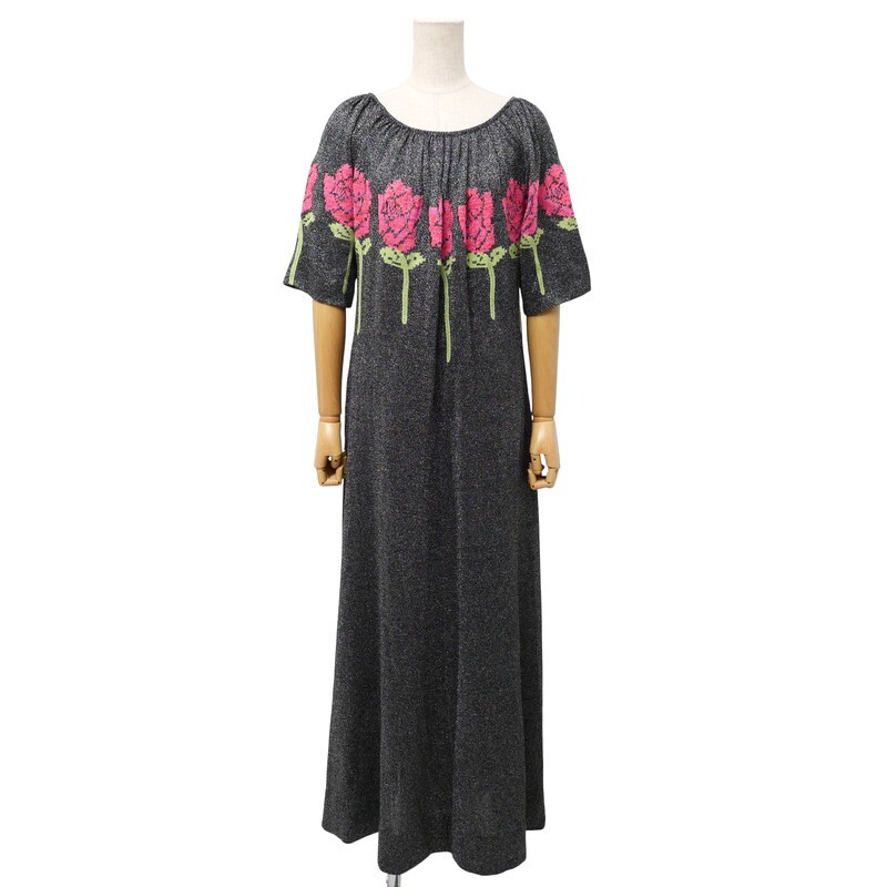 - TJ5157□斉藤都世子/トヨコサイトウ/Toyoko Saito 銀糸 バラ柄 襟元ギャザーゴム ロングニットワンピース 着丈約130cm 黒×シルバー系