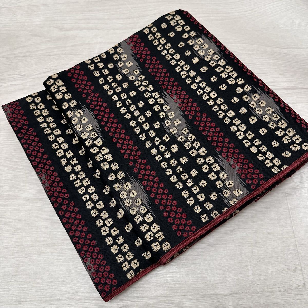 > 京袋帯 リバーシブル 黒地に可愛い織出し 格子柄 化繊 着物 Q-094
