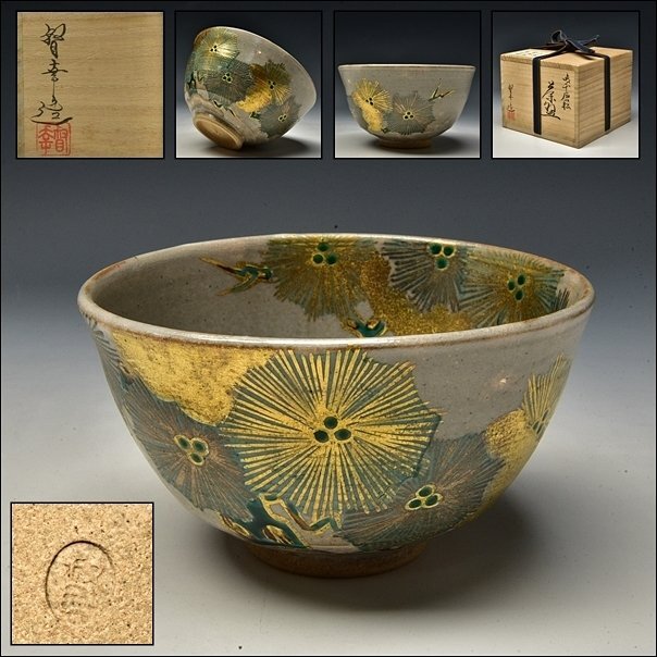 - SP6306 大石督幸 京焼 御本 唐松 金彩 茶碗 茶器 茶道具 共箱