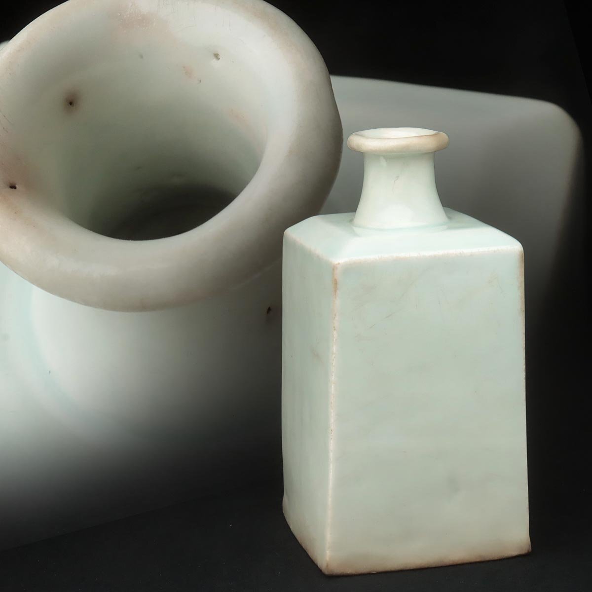 - FD167 朝鮮美術 李朝白磁角瓶 高18.7cm 木箱附・李朝白磁四方徳利・白瓷四方酒瓶・花瓶 酒器 朝鮮古陶 古美術
