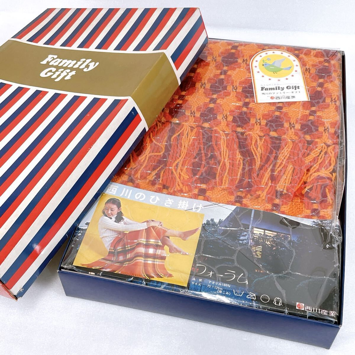 > ★昭和レトロ★ 東京 西川産業 西川のひざ掛け(75×125cm) オレンジ 当時物 肌掛け 編み込みブランケット ビンテージ【未使用/長期保管品】