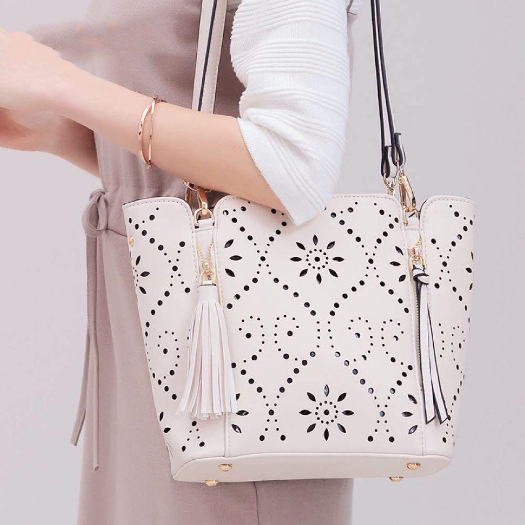 > Y55★ショルダーバッグ トートバッグ ハンドバッグ 花柄 パンチング タッセル アイボリー レディース 肩掛け 上品 おしゃれ 通勤 韓国