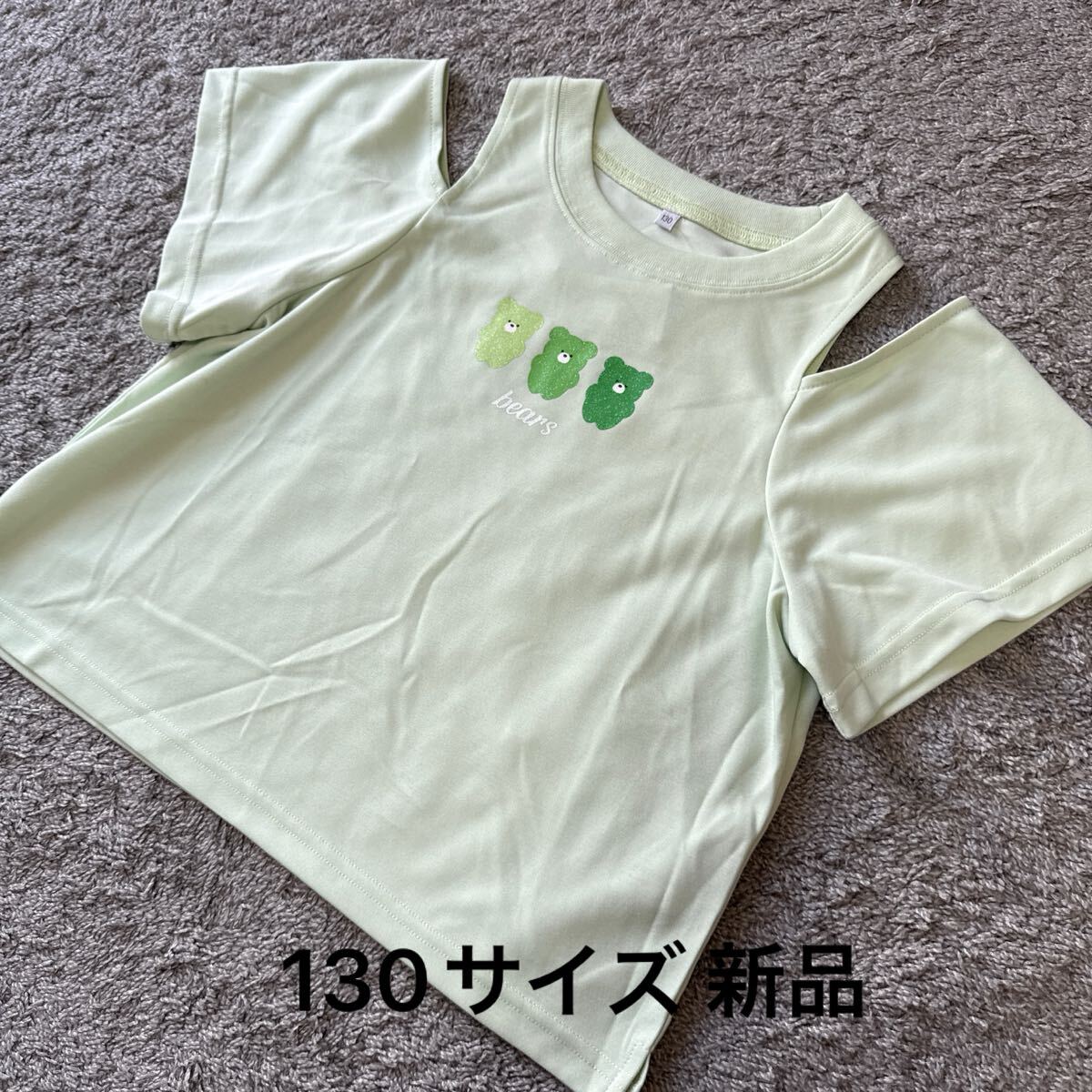 > こども服 オープンショルダーラメくまプリント半袖Tシャツライトグリーン130★ゆうパケット配送可能★新品36