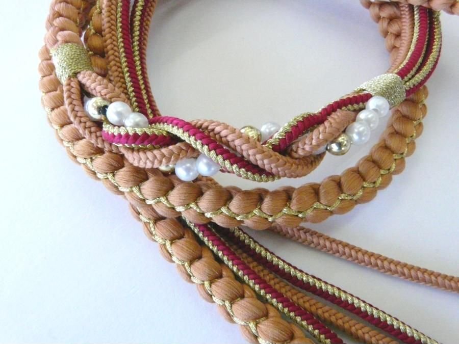 - 振袖用 飾り帯締め 正絹 手ぐみひも パールビーズ シンプル くすみ あんず色 ゴールド 064 ggp