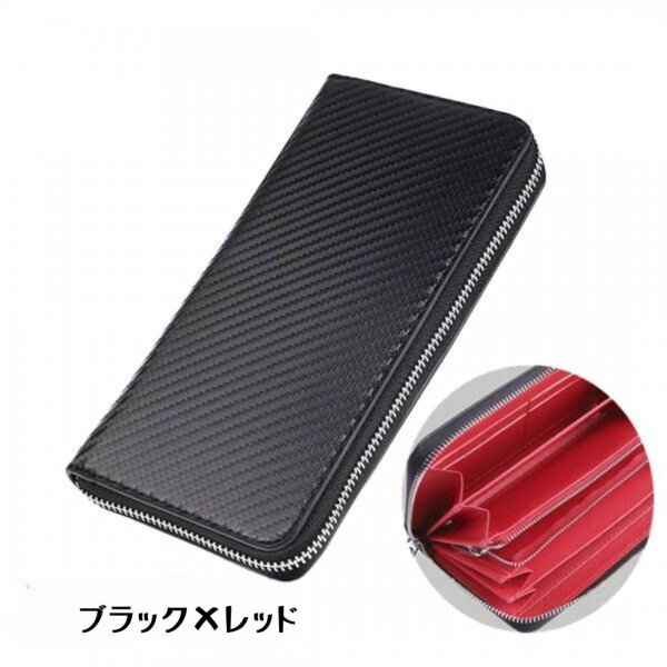 - 長財布 メンズ カーボン 財布 軽量 小銭入れ大きく開く 使いやすい ラウンドファスナー 40代 50代 おしゃれ レッド