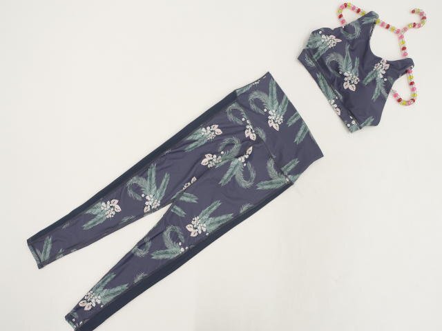 > 美品 ナージー NERGY スポーツブラ+レギンス 上下2点セット スポーツウェア M チャコールグレー地 グリーン×ピンク ボタニカル柄