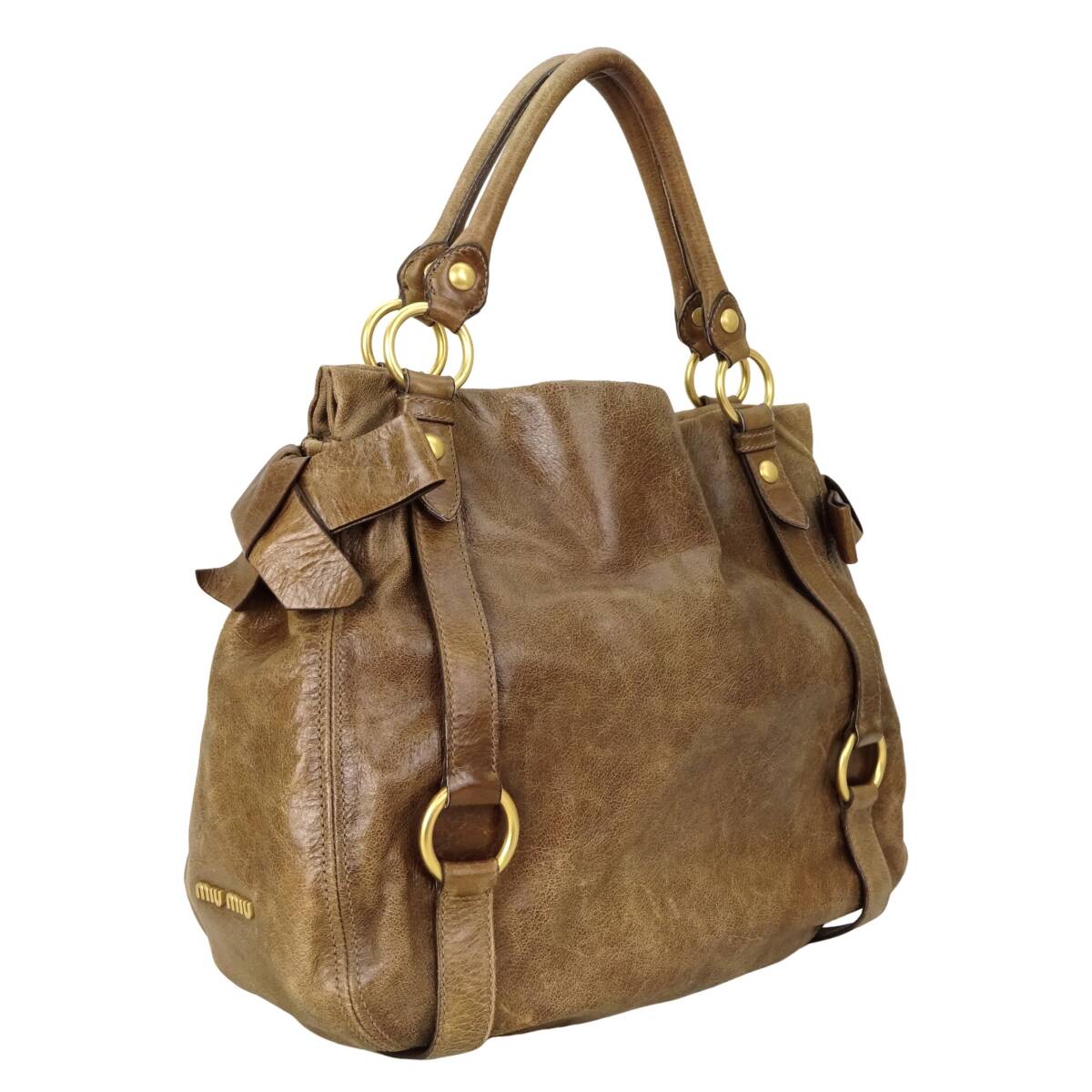 - 本物■ミュウミュウ■サイド リボン ブラウン レザー ゴールド ショルダートートバッグ ハンドバッグ