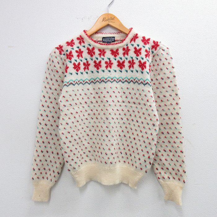 - 古着 ランズエンド 長袖 セーター レディース 90s 花 バーズアイ シェットランドウール クルーネック 生成り 25oct16 中古 ニット トップス