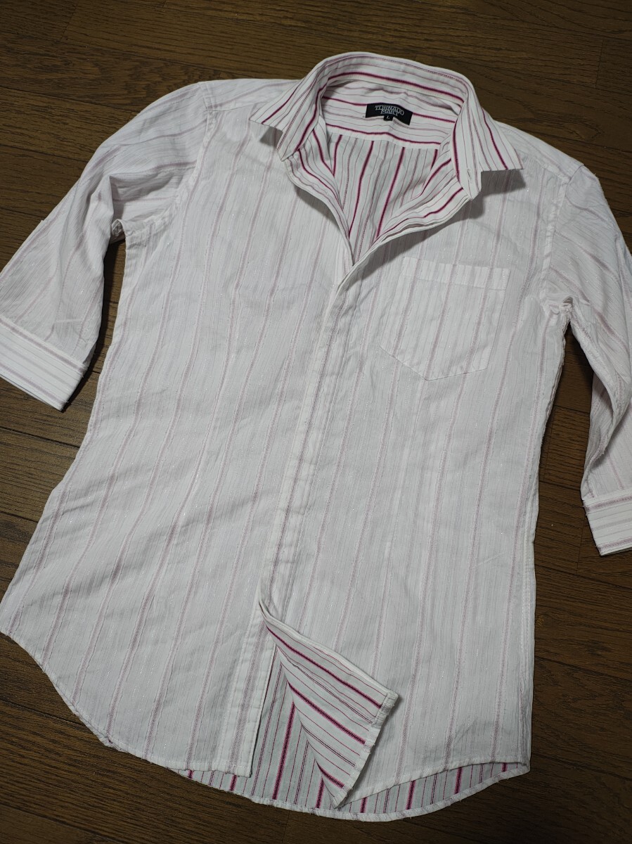 - TORNADOMART トルネードマート 春夏★ 7分袖 インサイドアウトシャツ/裏面使いシャツ ラメ糸使用ストライプ シャツ Sz.L メンズ 日本製