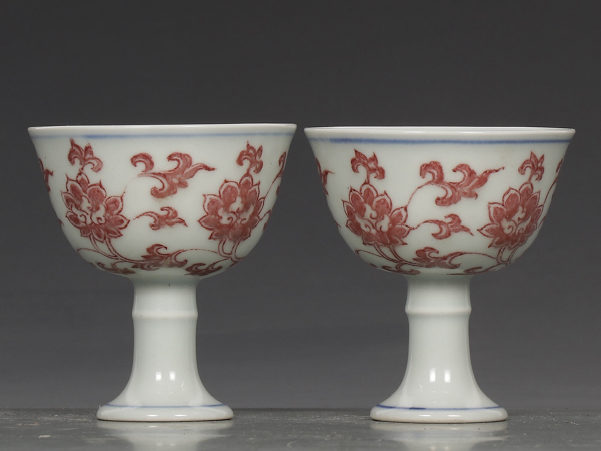 - ▽鴻▽明時代 陶磁器 釉裡紅蓮紋高足杯一対 明成化年製款 共箱 時代物 中国古美術 骨董品