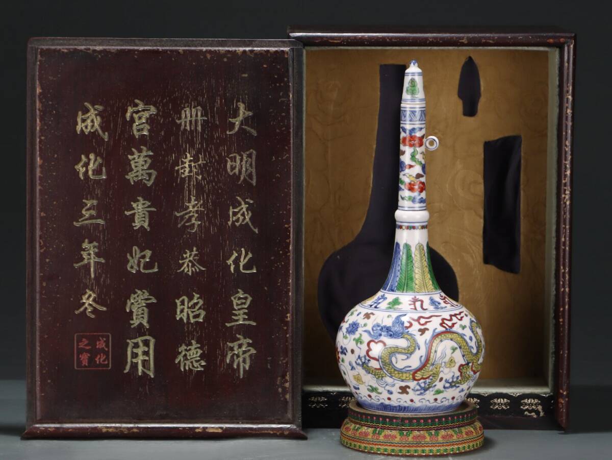 > ▽鴻▽明朝時代 陶磁器 成化年製 斗彩纏枝祥雲龍紋長頸瓶 時代木箱付き 染付 時代物 中国古美術 骨董品