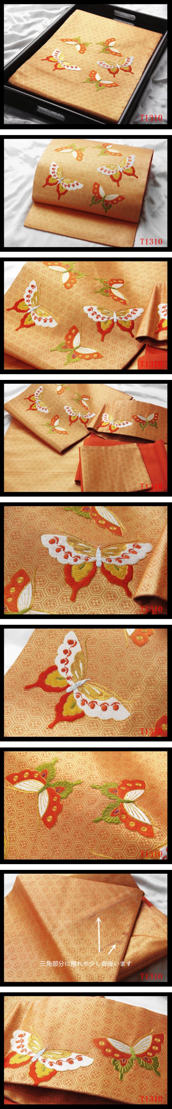 > 蔵【T1310】厳選美品 刺繍 蝶紋 赤橙色地 気品豊かに 正絹純金糸高級美術名古屋帯 ◇検簪着物袋帯和装小物帯締め
