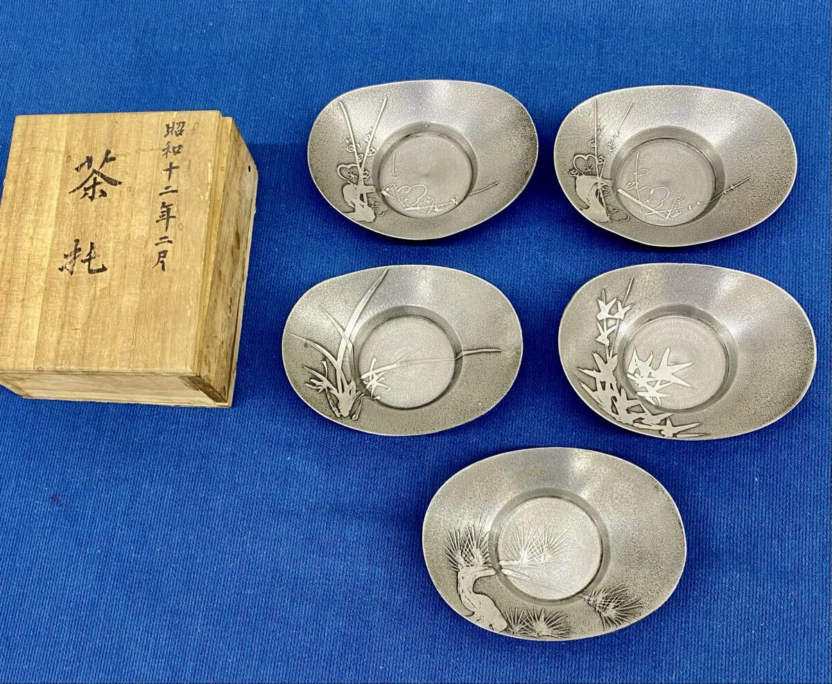 - 〈N8998〉 錫製 茶托 乾茂號造 5枚セット 煎茶道具 茶道具 茶器 純錫製 木箱入