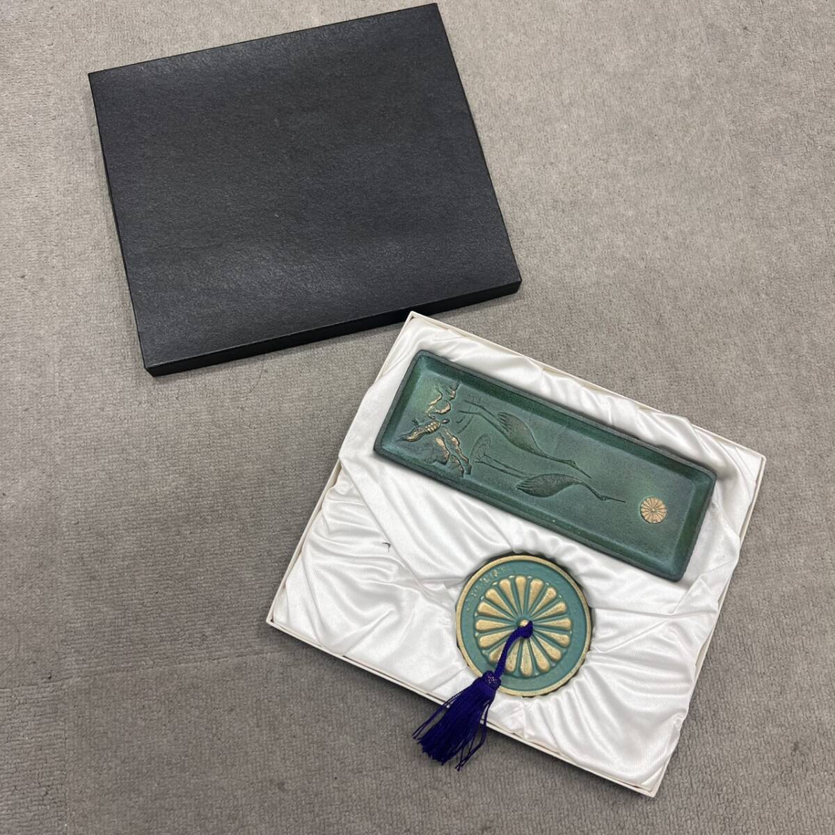 - #15000 【伝統工芸品】 鋳物 菊 文鎮丸型 菊 鶴 筆入 ペーパーウエイト 現状品 年代不明