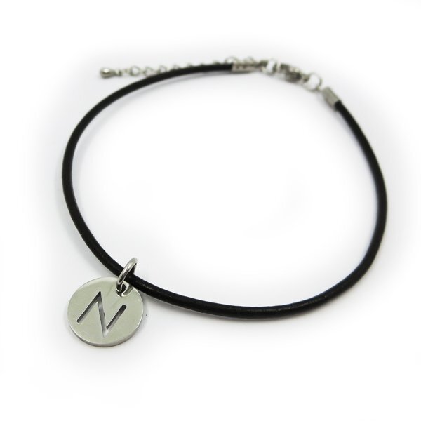 - N レザーアンクレット イニシャルチャーム付き ラウンド型 ステンレス金具 28cm(24+4cmアジャスター)