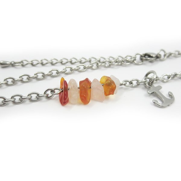 - ステンレスチェーンアンクレット カーネリアン&ローズクォーツ チャーム付き 3mm幅小豆チェーン 25cm(21cm+4cmアジャスター)