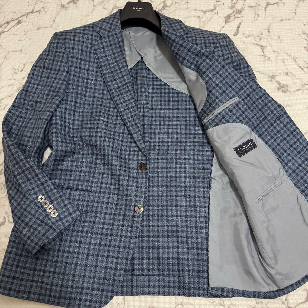 - 極美品/XL/TROJAN トロージャン LoroPiana 三者混 リネン シルク チェック 最高級 ロロピアーナ テーラードジャケット ブルー アンコン