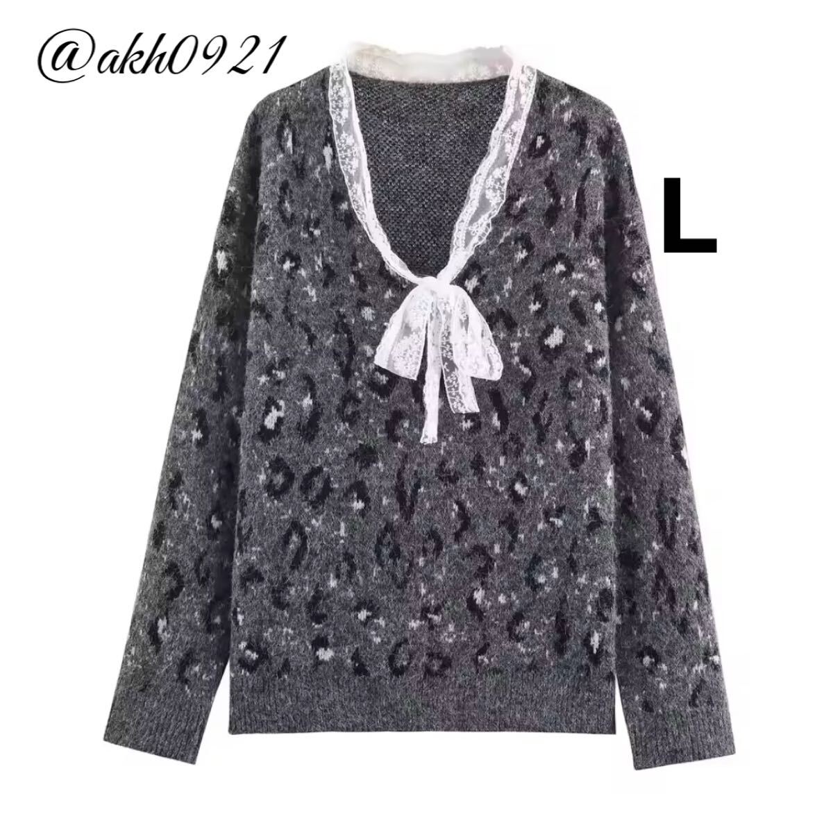 - 新品 秋新作 vintage ヴィンテージ レトロ レオパード 豹柄 レース ボウタイ ニット セーター トップス Lサイズ レディース ZARA好きな方に