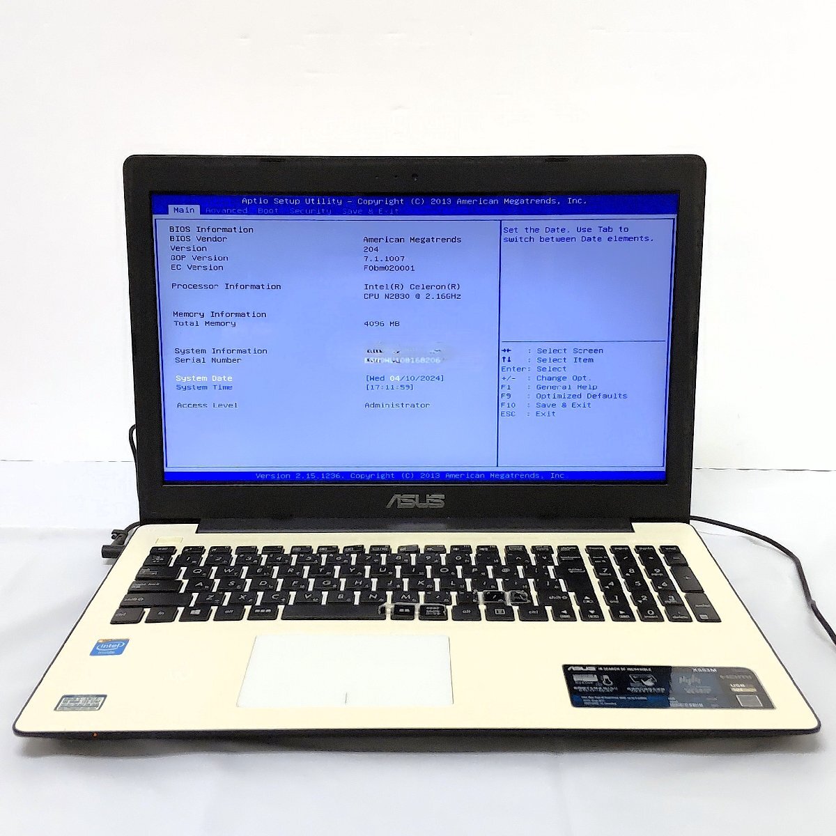 > MJ1901C【BIOS確認のみ/中古現状品】ASUS X553M ホワイト CPU: celeron(R) N2830@2.16GHz ストレージ:なし メモリ:4GB N