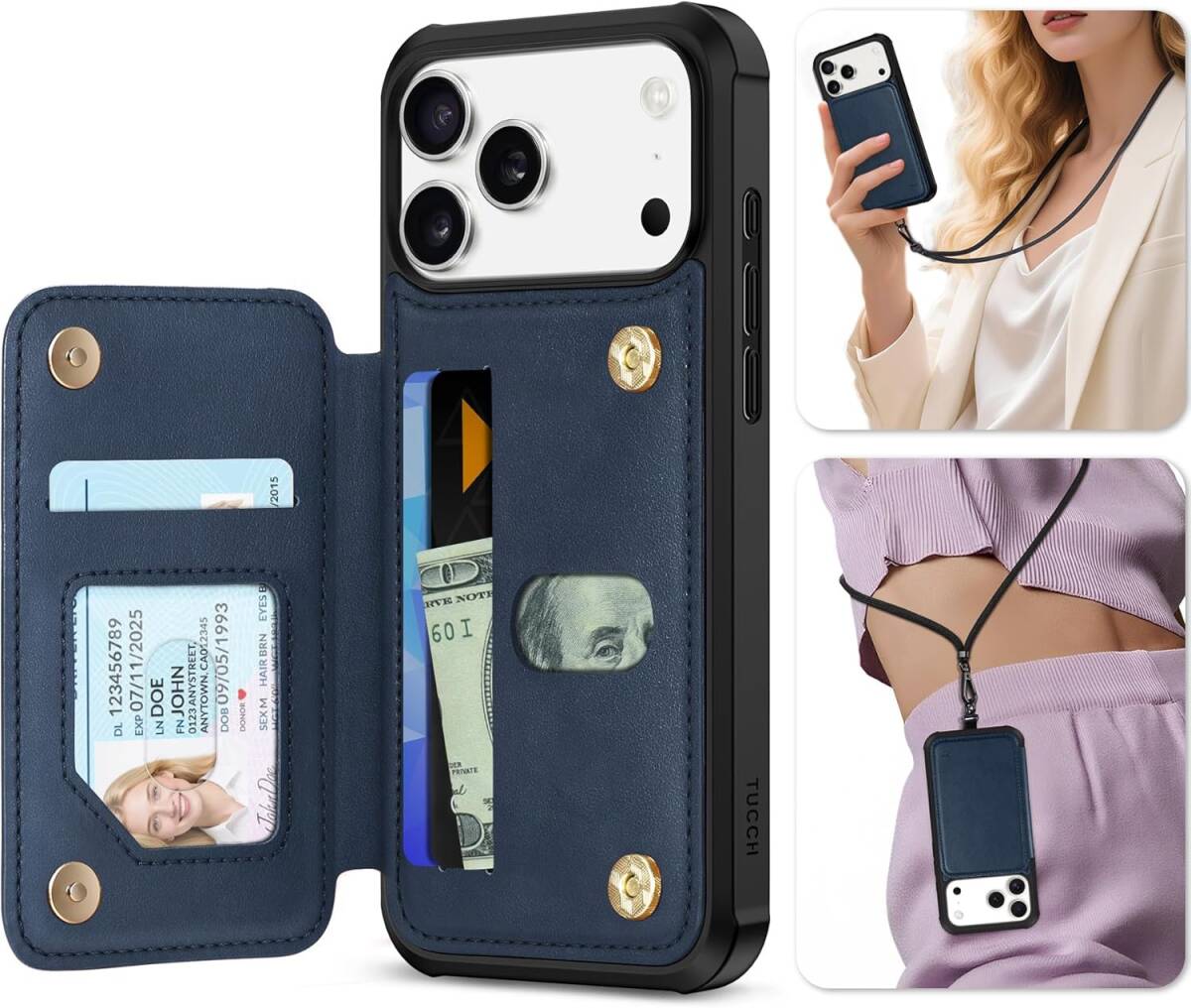 - 【未使用送料】TUCCH iPhone 17 Pro Max 対応 ケース ショルダーストラップ付き 背面カード収納ダークブルー PUレザー RFIDブロッキング