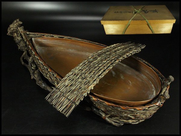 - 【金閣】網籠 舟形 水盤 奇木 根木 時代物 旧家蔵出 送料無料(XA853)